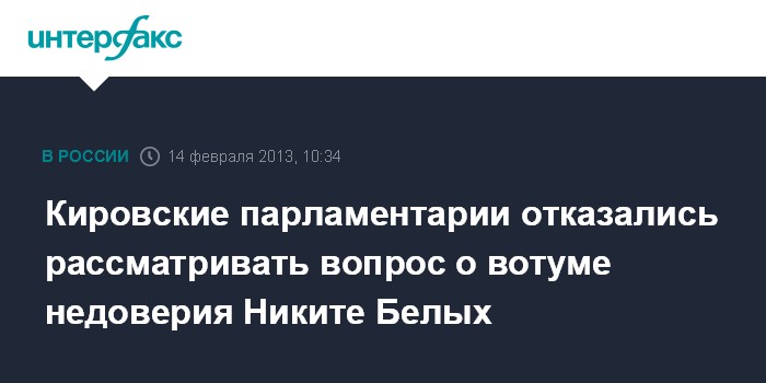 Киров. 14 февраля. INTERFAX.RU - Депутаты от фракции КПРФ в Заксобрании Кировской области на очередном заседании в четверг выступили с предложением рассмотреть вопрос о вотуме недоверия губернатору Никите Белых, однако коллеги их не поддержали.