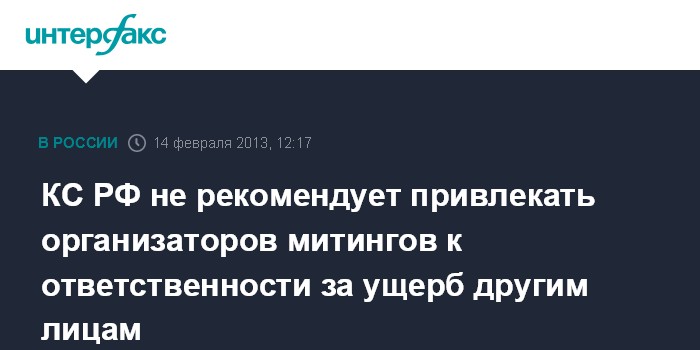 Санкт-Петербург. 14 февраля. INTERFAX.RU - Возмещать ущерб, причиненный участниками массовых акций, переросших в беспорядки, обязано государство, а не организаторы мероприятия, постановил Конституционный суд РФ.