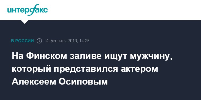 Как сообщил "Интерфаксу" источник в правоохранительных органах, вечером в среду в полицию обратилась Ольга Калинина, которая сообщила, что гуляла по Финскому заливу днем с мужчиной, который представлялся Алексеем Осиповым - актером кино.