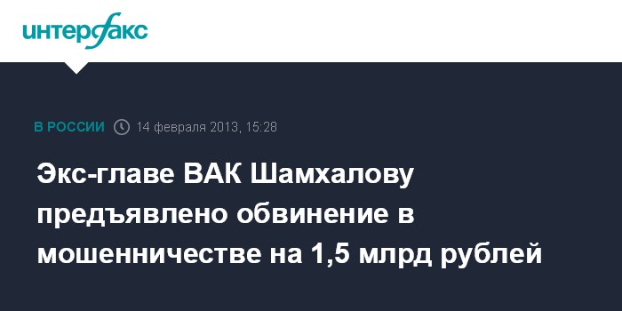 Москва. 14 февраля. INTERFAX.RU - Отстраненному от должности председателю Высшей аттестационной комиссии (ВАК) при министерстве образования и науки РФ Феликсу Шамхалову предъявлено обвинение в крупном мошенничестве, сообщила официальный представитель ГСУ столичного ГУ МВД Елена Молотилкина.