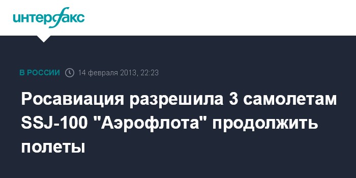 Москва. 14 февраля. INTERFAX.RU - Росавиация возобновила действия сертификатов летной годности трех воздушных судов Sukhoi SuperJet-100 (SSJ-100) авиакомпании ОАО "Аэрофлот - российские авиалинии", у которых были выявлены неполадки в системах.