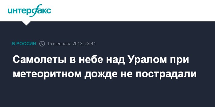 Москва. 15 февраля. INTERFAX.RU - Воздушные суда, находящиеся в небе над Уралом, не пострадали из-за метеоритного дождя, сообщили "Интерфаксу" в Уральском региональном центре МЧС РФ.