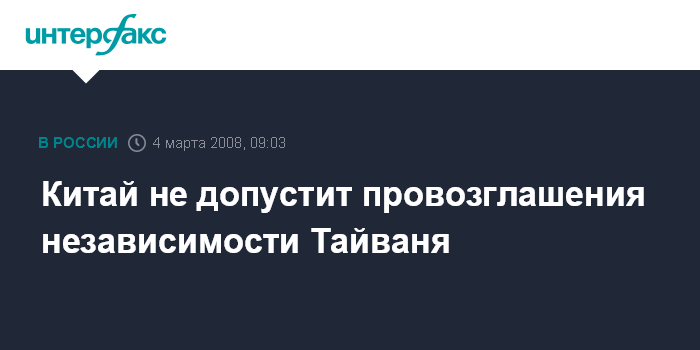Пекин. 4 марта. INTERFAX.RU - Китай не позволит кому-либо отделить Тайвань от Китая, заявил во вторник на брифинге официальный представитель открывающейся сессии Всекитайского собрания народных представителей (ВСНП, высший орган законодательной власти Китая - ИФ) Цзян Эньчжу.
