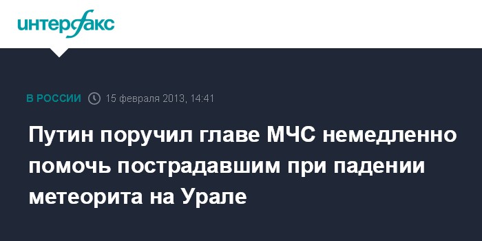 Москва. 15 февраля. INTERFAX.RU - Президент России Владимир Путин поручил главе МЧС Владимиру Пучкову оказать необходимую помощь людям, пострадавшим в результате падения метеорита на Урале.