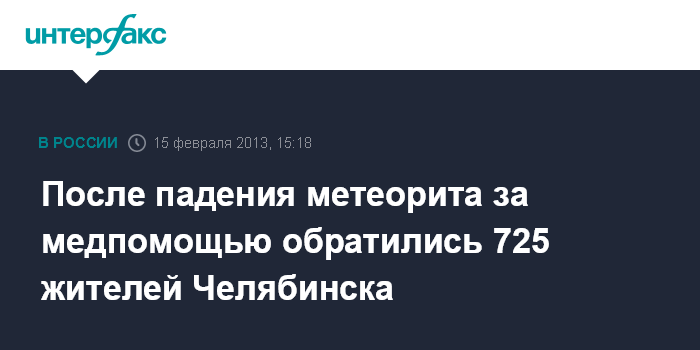 Челябинск. 15 февраля. INTERFAX.RU - В лечебные учреждения Челябинска после полета метеорита за медицинской помощью обратились 725 человек, из них 159 детей, сообщается на сайте горадминистрации.