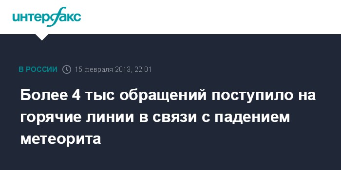 Челябинск. 15 февраля. INTERFAX.RU - Более 4 тыс. человек обратились на горячие линии после падения метеоритов в Челябинской области, сообщил глава МЧС Владимир Пучков на совещании в Челябинске.