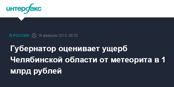 Челябинск. 16 февраля. ИНТЕРФАКС - Ущерб от падения осколков метеорита в Челябинской области превышает 1 млрд рублей, заявил глава региона Михаил Юревич журналистам в субботу.