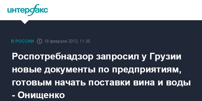 7 февраля Роспотребнадзор проинформировал Грузию о готовности проинспектировать три десятка предприятий, которые собираются поставлять вино и минеральную воду на рынок РФ.