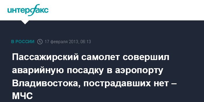 Москва. 17 февраля. ИНТЕРФАКС – Пассажирский самолет Ту-204 благополучно совершил аварийную посадку в аэропорту Владивостока в воскресенье, сообщает МЧС России.