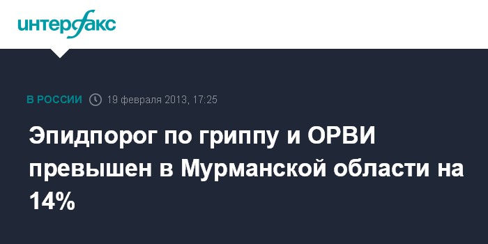 Мурманск. 19 февраля. INTERFAX.RU - Эпидемический порог заболеваемости гриппом и ОРВИ в Мурманской области превышен на 13,8%, сообщает пресс-служба регионального Роспотребнадзора во вторник.
