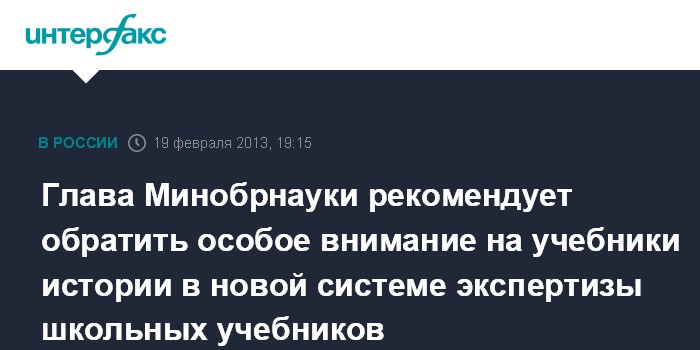 Москва. 19 февраля. ИНТЕРФАКС - Учебник истории должен занять главное место в проходящем в настоящее время тестировании новой системы экспертизы школьных учебников, считает глава Минобрнауки РФ Дмитрий Ливанов.