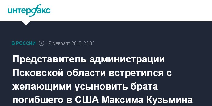 Псков. 19 февраля. INTERFAX.RU - В администрации Псковской области состоялась встреча с семьями, изъявившими желание усыновить Кирилла Кузьмина - брата Максима Кузьмина, трагически погибшего в конце января в США от рук приемных родителей, сообщает во вторник пресс-служба администрации региона.