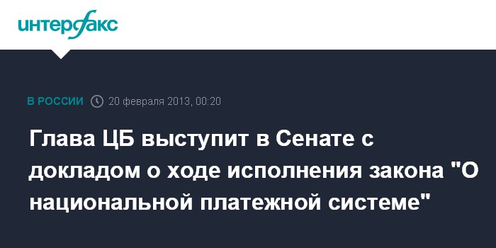 Глава ЦБ выступит в Сенате с докладом о ходе исполнения закона "О национальной платежной системе"