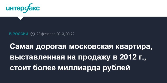 Самая дорогая московская квартира, выставленная на продажу в 2012 г., стоит более миллиарда рублей