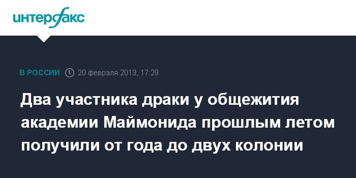 Москва. 20 февраля. INTERFAX.RU - Солнцевский суд Москвы приговорил к тюремным срокам двоих участников драки у общежития академии им. Маймонида с полицейскими, которые пришли задерживать фигурантов другого конфликта - у торгового центра "Европейский".