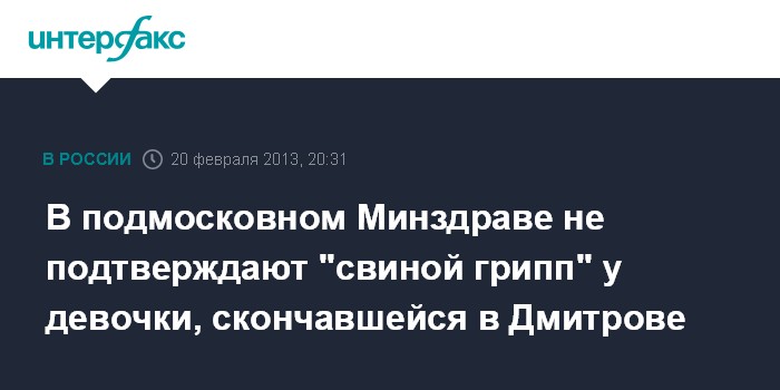 Москва. 20 февраля. INTERFAX.RU - Диагноз "свиной грипп" у девочки, погибшей в подмосковном Дмитрове, пока не подтвердился, точные выводы можно будет сделать после соответствующих анализов, сделанных Роспотребнадзором, заявила министр здравоохранения Московской области Нина Суслонова.