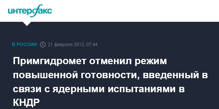 Владивосток. 21 февраля. ИНТЕРФАКС-ДАЛЬНИЙ ВОСТОК - Примгидромет отменил режим повышенной готовности, введенный после проведения КНДР 12 февраля ядерного испытания.