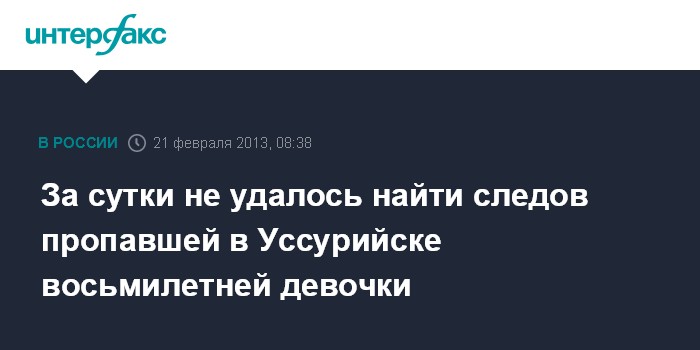 Владивосток. 21 февраля. INTERFAX.RU - В Приморье продолжаются поиски пропавшей в городе Уссурийске восьмилетней Насти Луцышиной, за сутки следов ребенка найти не удалось. "Поступает много звонков от людей. Говорят, что кто-то видел девочку, что нашли какую-то куртку, якобы пропавшей. Но при проверке выясняется, что видели другого ребенка, а найденная куртка вообще на взрослого человека", - сообщила в четверг "Интерфаксу" пресс-секретарь УВД Уссурийска Ольга Корбут.