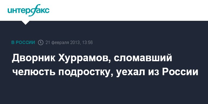 Москва. 21 февраля. INTERFAX.RU - Дворник из Узбекистана Бахром Хуррамов, которого обвинили в нанесении травмы подростку-москвичу, покинул Россию, а жилищную организацию, в которой он трудился, оштрафовали, сообщили "Интерфаксу" в четверг в Федеральной миграционной службе.