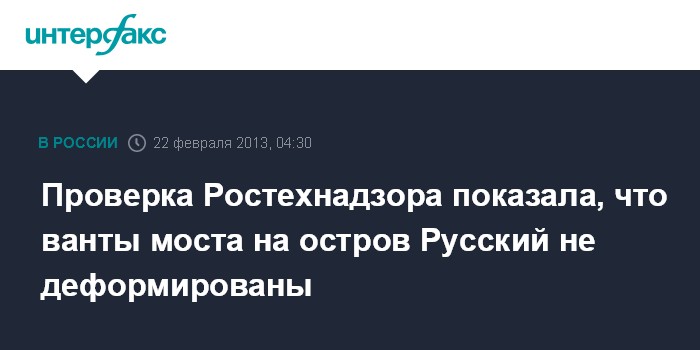 Владивосток. 22 февраля. ИНТЕРФАКС-ДАЛЬНИЙ ВОСТОК - Дальневосточное управление Ростехнадзора заключило, что ванты моста на остров Русский не были деформированы.