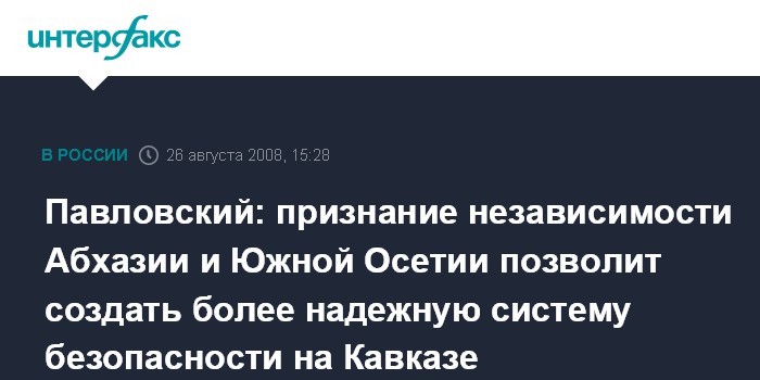 "Признание независимости Абхазии и Южной Осетии являлось для России неизбежной мерой. Это ни в коем случае не демонстрация нашей силы и не притязание на территорию Грузии, которую мы не обсуждаем и не оспариваем. Просто Россия исчерпала все возможности другой модели (урегулирования - ИФ)", - заявил "Интерфаксу" президент Фонда эффективной политики Глеб Павловский, комментируя заявление президента РФ о признании независимости Южной Осетии и Абхазии. По мнению политолога, "признав независимость, мы фактически говорим: теперь давайте вести в любом формате, в том числе европейском, дальнейшие переговоры по национальному строительству и миру на Кавказе при участии этих двух народов".