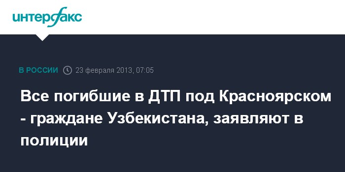 Красноярск. 23 февраля. ИНТЕРФАКС-СИБИРЬ - Установлены личности всех пяти погибших в результате автоаварии в Красноярском крае, это граждане Узбекистана, сообщили агентству "Интерфакс-Сибирь" в пресс-службе ГУ МВД России по региону.