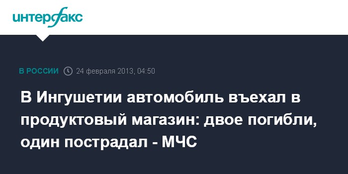 Москва. 24 февраля. ИНТЕРФАКС - В Ингушетии легковой автомобиль врезался в продуктовый магазин, в результате чего погибли два человека, сообщили "Интерфаксу" в воскресенье в Национальном центре управления в кризисных ситуациях МЧС РФ.