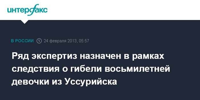 Владивосток. 24 февраля. ИНТЕРФАКС-ДАЛЬНИЙ ВОСТОК - В рамках расследования обстоятельств гибели восьмилетней жительницы Уссурийска, тело которой после пятидневных поисков было найдено в пригородной зоне, назначен ряд экспертиз, сообщает в воскресенье СКР по Приморью.