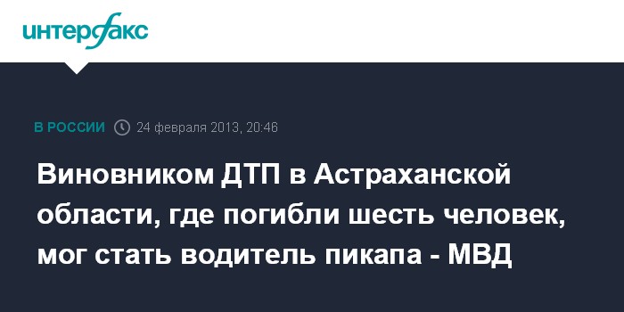 Как сообщалось, в 18:15 мск в Енотаевском районе Астраханской области столкнулись две легковые автомашины - ВАЗ-2199 и "Мицубиси Лансер". В результате ДТП шесть человек в автомашиных погибли, в том числе ребенок полутора-двух лет. ДТП произошло на 1264-м км федеральной автодороги М6.