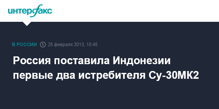 "В конце прошлой недели транспортным самолетом была отправлена первая пара Су-30МК2 для индонезийских ВВС. Таким образом, Россия начала выполнение контракта, подписанного в конце 2011 года, на поставку в Индонезию партии из шести истребителей Су-30МК2", - сказал собеседник агентства.
