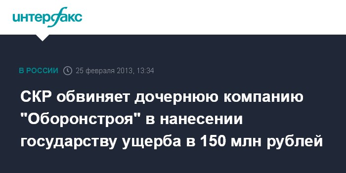 СКР обвиняет дочернюю компанию "Оборонстроя" в нанесении государству ущерба в 150 млн рублей