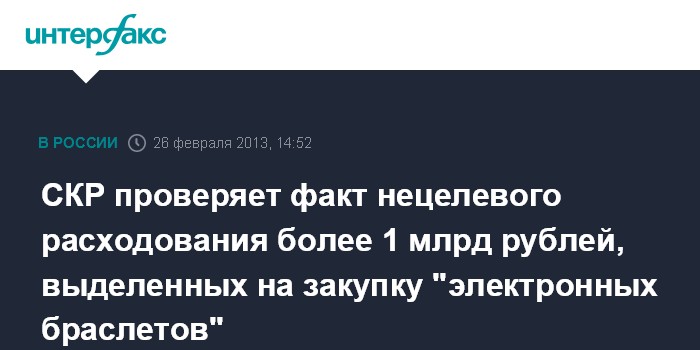 "Проводится проверка по факту нецелевого расходования более миллиарда бюджетных средств, которые были выделены на закупку "электронных браслетов", - сообщил официальный представитель Следственного комитета России Владимир Маркин в своем микроблоге в Твиттере