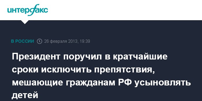 Ново-Огарево. 26 февраля. INTERFAX.RU - Президент РФ Владимир Путин поручил правительству исключить все препоны, которые ограничивают граждан России, желающих усыновить детей.