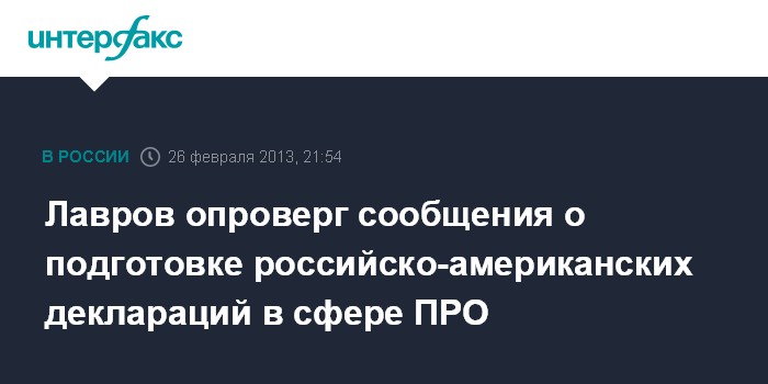 Берлин. 26 февраля. INTERFAX.RU - Глава МИД РФ Сергей Лавров опроверг появившуюся в СМИ информацию о якобы готовящемся между Россией и США обмене декларациями о сотрудничестве в сфере ПРО и ее ненаправленности против интересов РФ.