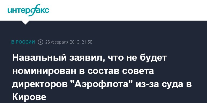 Москва. 26 февраля. INTERFAX.RU - Оппозиционер Алексей Навальный знал, что его кандидатура не будет выдвинута в совет директоров ОАО "Аэрофлот-Российские авиалинии".