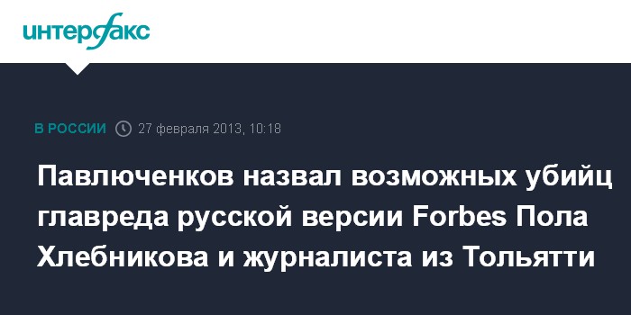 Павлюченков назвал возможных убийц главреда русской версии Forbes Пола Хлебникова и журналиста из Тольятти