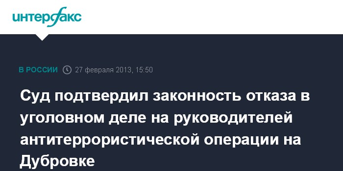 Москва. 27 февраля. INTERFAX.RU - Лефортовский суд Москвы признал законным отказ следователя возбудить уголовное дело в отношении должностных лиц, руководивших операцией по освобождению заложников в Театральном центре на Дубровке в 2002 году.