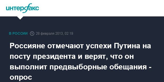 По их данным, за год уровень поддержки главы государства не снизился: в начале 2012 года 66% респондентов заявляли о положительном влиянии В.Путина на положение дел в стране, в начале 2013 года таковых оказалось 65%.