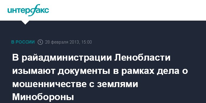 Санкт-Петербург. 28 февраля. INTERFAX.RU - Сотрудники следственного управления СКР Ленинградской области и регионального управления МВД проводят в четверг оперативно-следственные мероприятия в администрации Всеволожского района. Как сообщили "Интерфаксу" в региональном управлении СКР в четверг, выемка документов проводится в рамках расследования мошенничества с землями Минобороны.