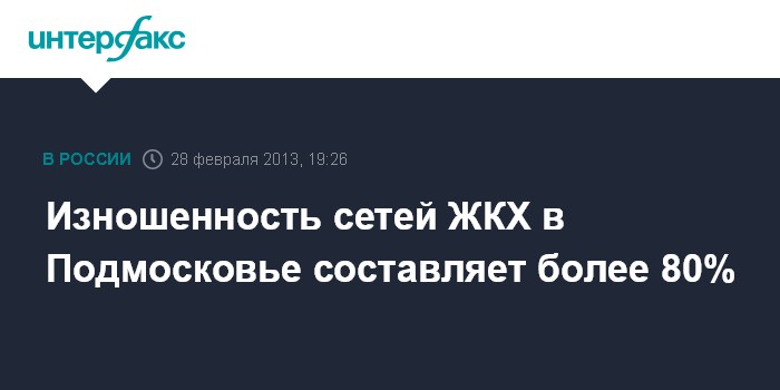 Москва. 28 февраля. INTERFAX.RU - Врио губернатора Московской области заявил, что изношенность сетей жилищно-коммунального хозяйства в регионе составляет более 80%.