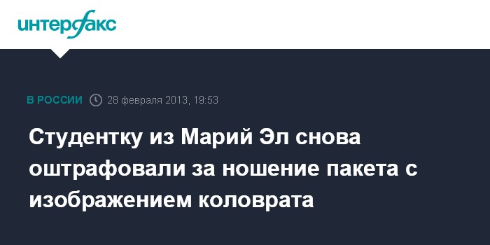 Казань. 28 февраля. INTERFAX.RU - Суд города Волжска (Республика Марий Эл) признал виновной первокурсницу местного вуза Анастасию Коновалову, которую задержали полицейские в Казани за ношение пакета с изображением коловрата.