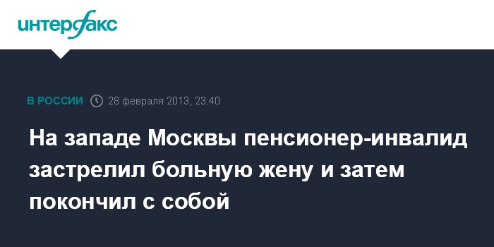 Москва. 28 февраля. INTERFAX.RU - Пожилой москвич застрелил супругу и покончил с собой на западе Москвы, сообщил в четверг "Интерфаксу" источник в правоохранительных органах.