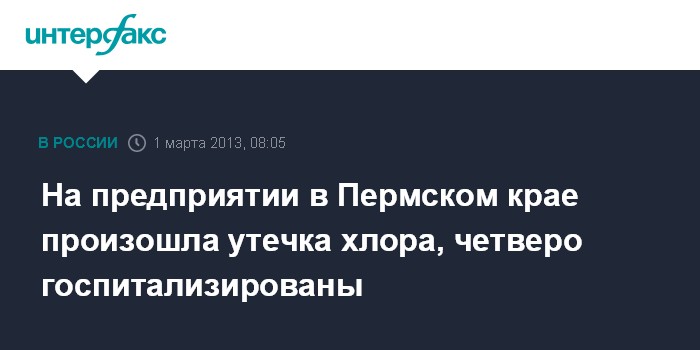 Пермь. 1 марта. INTERFAX.RU - В Березниках (Пермский край) на предприятии "Сода-хлорат" произошла утечка хлора, из-за чего четыре человека были доставлены в больницу, сообщил агентству "Интерфакс-Поволжье" представитель ГУ МЧС по Пермскому краю.
