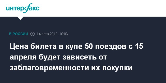 Москва. 1 марта. ИНТЕРФАКС - Стоимость проезда в купейных вагонах 50 поездов дальнего следования, которые будут отправляться с 15 апреля по 31 мая и с 1 сентября по 30 ноября, будет зависеть от заблаговременности покупки билетов.