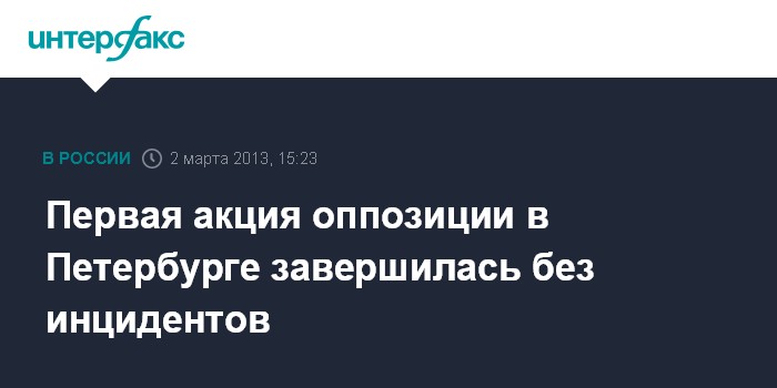 Санкт-Петербург. 2 марта. INTERFAX.RU - Одна из запланированных на субботу оппозиционных акций в Санкт-Петербурге прошла без происшествий, сообщили "Интерфаксу" в ГУ МВД по Петербургу.