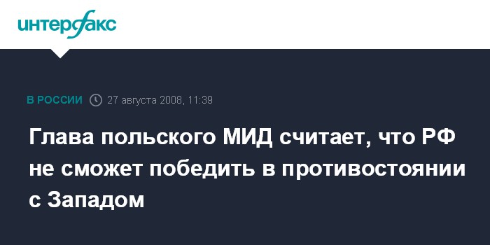 Москва. 27 августа. INTERFAX.RU - В случае конфронтации между Россией и Западом Россия проиграет, считает министр иностранных дел Польши Радослав Сикорский.