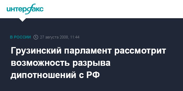 Москва. 27 августа. INTERFAX.RU - Бюро парламента Грузии в среду рассмотрит вопрос о разрыве дипломатических отношении с Россией, сообщил "Интерфаксу" глава временной парламентской комиссии по восстановлению территориальной целостности Грузии Шота Малашхия.