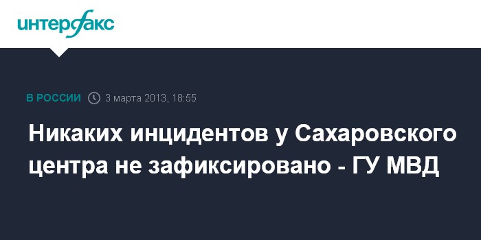 Москва. 3 марта. INTERFAX.RU - В пресс-службе ГУ МВД России по Москве "Интерфаксу" опровергли сообщения в Интернете и некоторых СМИ о якобы имевших место инцидентах, связанных с нарушением общественного порядка, около Сахаровского центра в Москве и в нем самом. "Обстановка спокойная, каких-либо происшествий, связанных с нарушением правопорядка по данному адресу не зафиксировано", - сказал сотрудник пресс-службы.