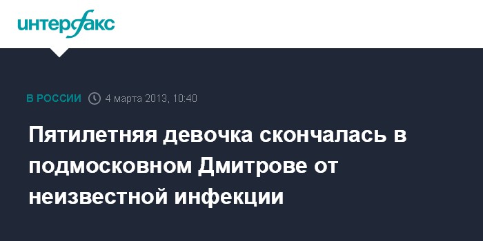 Москва. 4 марта. INTERFAX.RU - Следователи допрашивают врачей Дмитровской больницы и подстанции "скорой помощи" в связи со смертью в минувшую субботу пятилетней девочки, предположительно, от неизвестной инфекции, сообщила в понедельник официальный представитель подмосковного управления Следственного комитета России Ирина Гуменная.