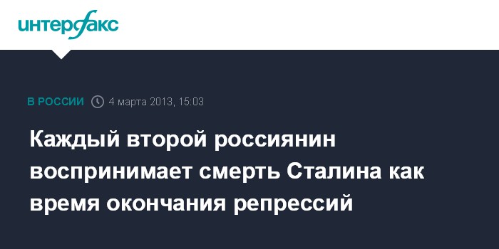 Москва. 4 марта. INTERFAX.RU - Россияне ассоциируют смерть советского руководителя Иосифа Сталина в большей степени с прекращением массовых репрессий, нежели с утратой великого вождя и учителя (55% против 18%), сообщают социологи "Левада-центра".